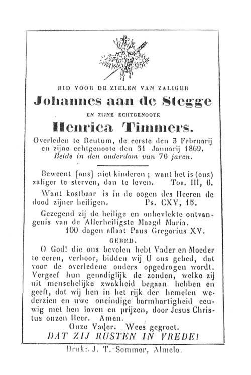 Joannes en Henrica zijn kort achter elkaar overleden in 1869. Er is destijds daarom slechts één bidprentje gedrukt: